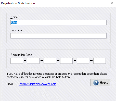 It is essential that your computer's built in clock is correctly set as the Registration Code may detect non synchronous dates and block all further attempts to install. Even if the clock is subsequently reset correctly! Programs once installed will however continue to operate after the time expiry data of the Registration Code that was used to install them.Each Mistral Registration Code issued is unique to each registered Licensee. Attempting to pass a Mistral Registration Code to a third party without the permission of Mistral Associates is illegal under provisions of The Computer Misuse Act 1990. It also damages our Refrigeration & Air Conditioning industry and the same industry within which you, as a professional member of it, must earn your living! Don't do it! Registration Codes are also recorded and are easily traceable. Attempting to use an access Registration Code illegally will also risk permanently blocking further operation of any Mistral program on the affected computer through invisible code which can only be removed by an authorised Mistral representative. Following payment of a fee (or a Hard Drive format!).